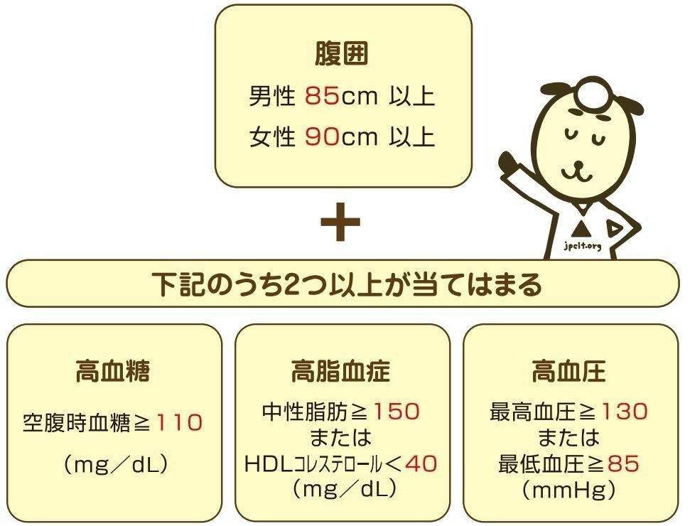 ※メタボリックシンドロームという言葉ができる以前は、「肥満」、「高血圧」、「脂質異常(高脂血症)」、「糖尿病」は「死の四重奏」と言われ注目されていました。「死の四重奏」をわかりやすく数値化したものが、次項のメタボリックシンドロームの診断基準です。